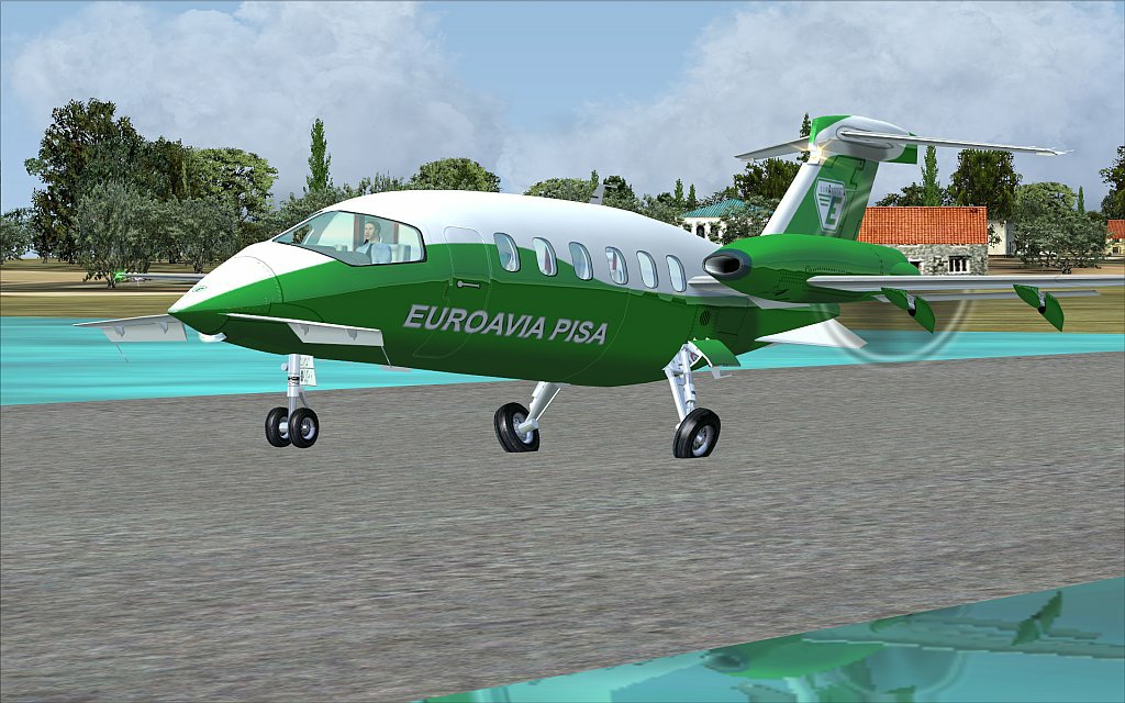 I found this aircraft on Avsim.com. Update: It can also be found here at the V. The P-180 is a pusher style 2 engine turboprop with a canard on the nose. There are 10 different liveries provided in the package. For this review I used the Euroavia Pisa fictional livery because I like green. The quality of the paint is excellent. The graphics are clear with nice reflection characteristics.